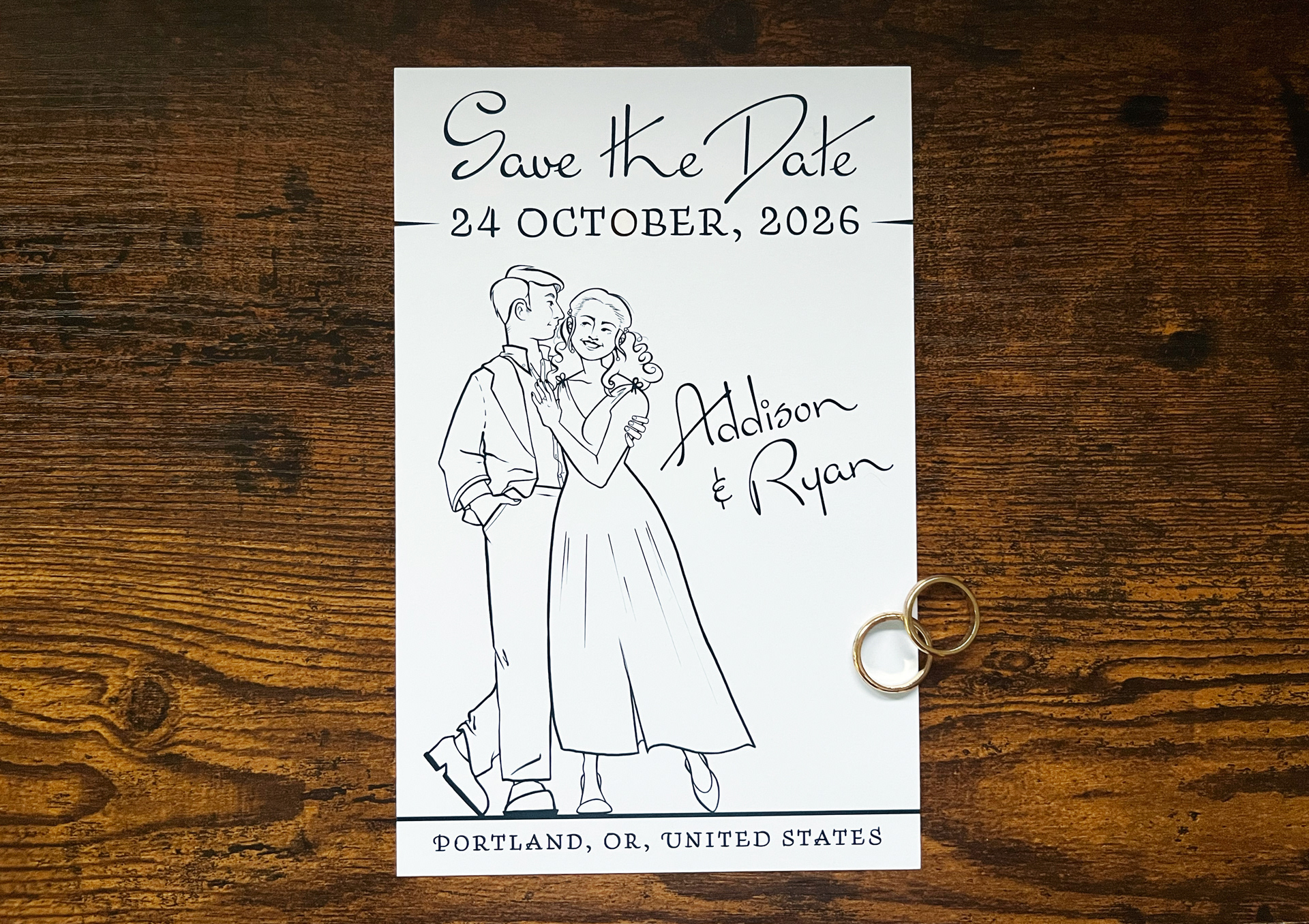 Two lovely friends of mine chose to tie the knot in 2026, and I was so honored to design their wedding stationery. The central element is a custom illustration featuring the two of them in an elegant pose.